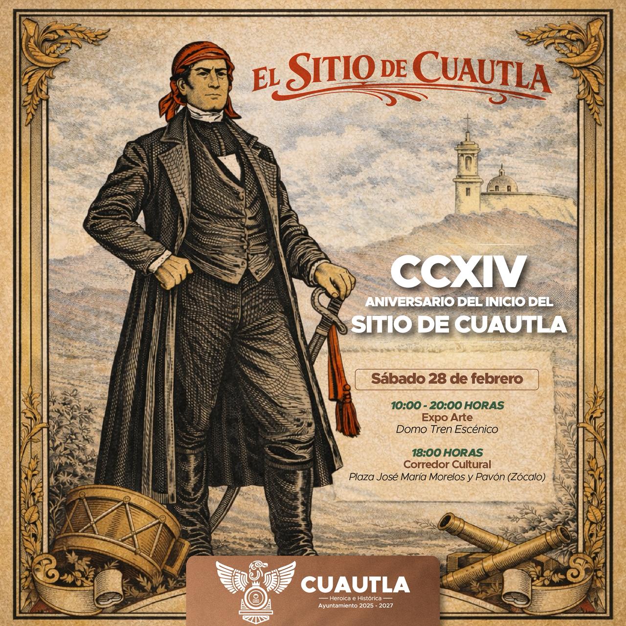 Como parte de las actividades contempladas en el Bando Solemne por el CCXIV Aniversario del inicio y rompimiento del Sitio de Cuautla de 1812, el Ayuntamiento de Cuautla que preside el alcalde Jesús Corona Damián invita a la ciudadanía a disfrutar del Corredor Cultural que se realizará este sábado 28 de febrero en el zócalo de la ciudad.