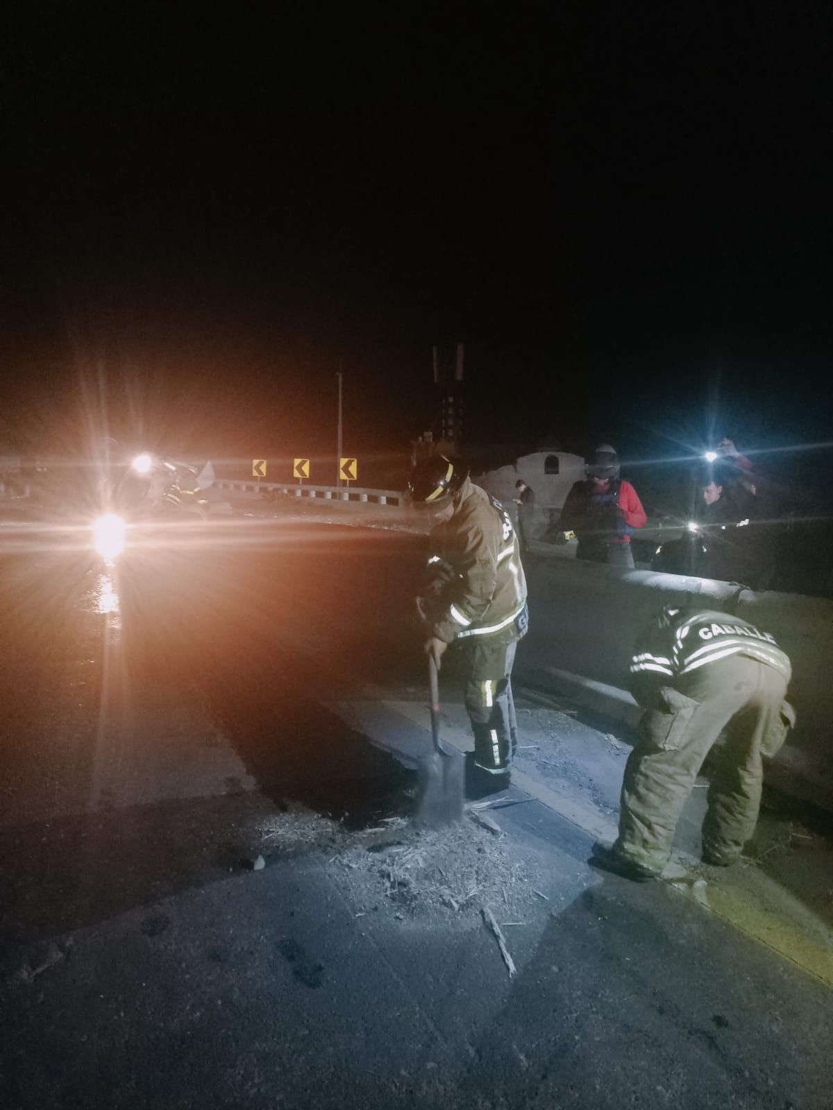 Como parte de las labores de seguridad, el personal de bomberos llevó a cabo la contención de combustible derramado mediante la aplicación de material absorbente en un tramo aproximado de 10 metros lineales, con el objetivo de prevenir riesgos para la circulación en la zona.